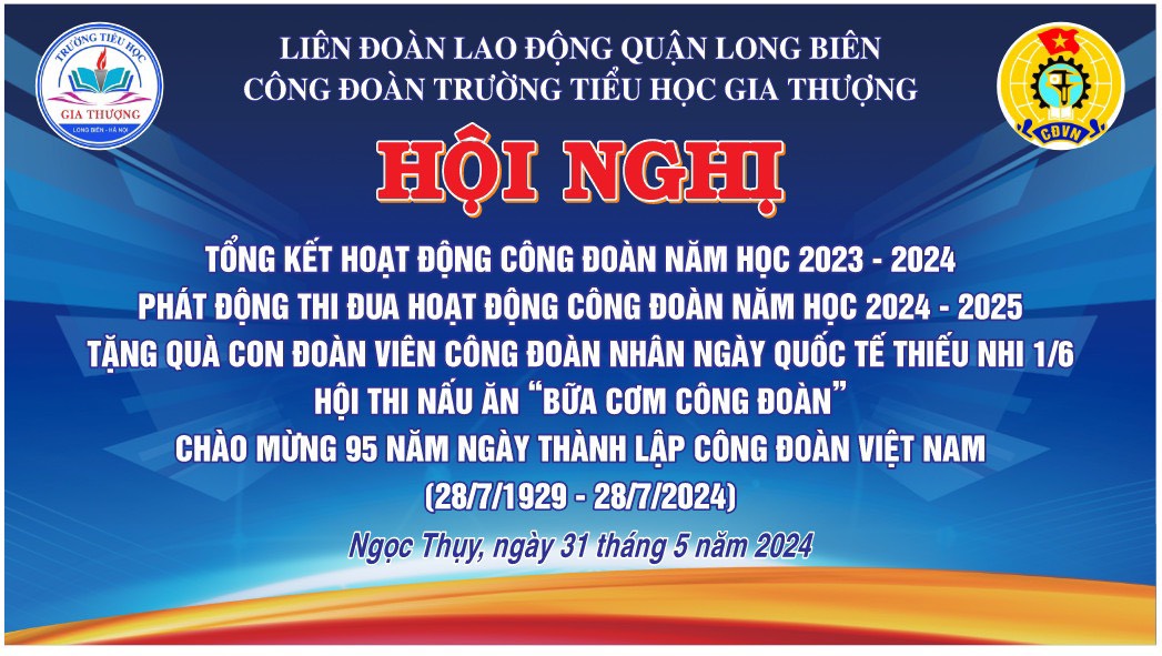 Sáng ngày 31/5/2024, Công đoàn trường Tiểu học Gia Thượng tổ chức Hội nghị Tổng kết hoạt động công đoàn năm học 2023-2024; Phát động thi đua hoạt động công đoàn năm học 2024-2025; Tặng quà con đoàn viên công đoàn nhân ngày Quốc tế Thiếu nhi 1/6; Hội thi nấu ăn “Bữa cơm công đoàn” chào mừng 95 năm Ngày thành lập Công đoàn Việt Nam. Đây thực sự là hoạt động có ý nghĩa, mang tính chất động viên, chia sẻ, tạo niềm vui, niềm hân hoan cho các đoàn viên nhà trường.