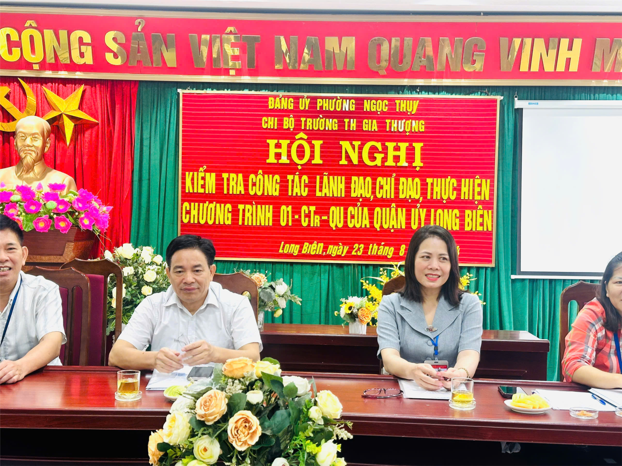 Thực hiện KH 145-KH/ĐU ngày 27/12/2023 của Đảng ủy phường Ngọc Thụy về Kế hoạch Kiểm tra, giám sát của Đảng ủy, Ban Thường vụ Đảng ủy phường Ngọc Thụy năm 2024; Quyết định số 313-QĐ/ĐU ngày 18/8/2024 về việc kiểm tra thực hiện chương trình 01-CTr/QU ngày 15/10/2020 của Quận uỷ Long Biên của Đảng uỷ phường Ngọc Thuỵ, hôm nay, ngày 23/8/2024 Đảng uỷ phường Ngọc Thuỵ thực hiện kiểm tra việc lãnh đạo, chỉ đạo, thực hiện Chương trình 01-CTr/QU ngày 15/10/2020 của Quận ủy, Kế hoạch của Đảng ủy phường thực hiện Chương trình số 01-CTr/QU của Quận ủy, Chương tình 01-CTr/TU của Thành ủy năm 2023 và 6 tháng đầu năm 2024 với Chi bộ trường Tiểu học Gia Thượng theo kế hoạch.