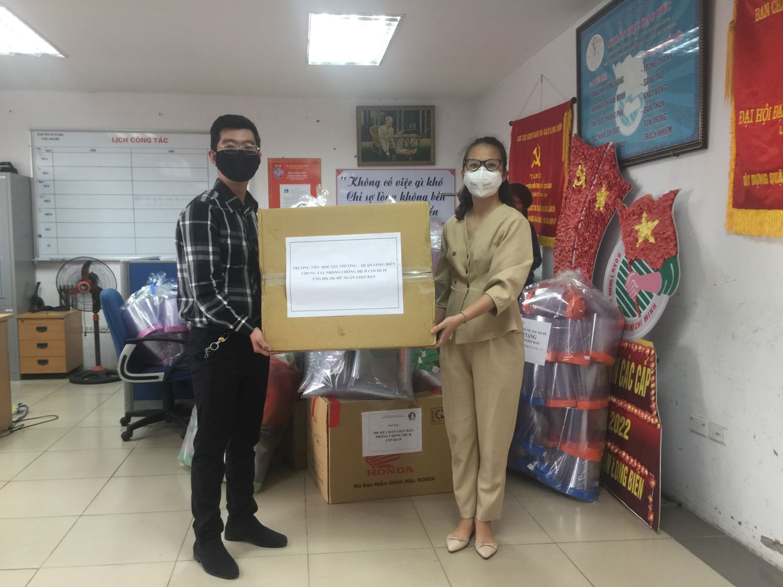 Trường Tiểu học Gia Thượng hội thu ủng hộ 250 mũ chắn giọt bắn qua Hội đồng Đội quận Long Biên.