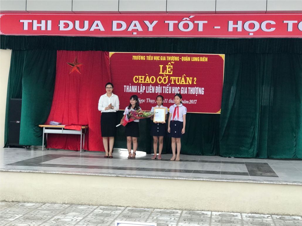 Sau phần nghi lễ, đồng chí Nguyễn Thị Thanh Tâm – Ủy viên Ban chấp hành Thành đoàn, Quận ủy viên, Bí thư Quận đoàn Long Biên, Chủ tịch Hội đồng Đội quận Long Biên đã lên trao quyết định thành lập Liên đội và công nhận BCH Liên đội lâm thời. Liên đội Tiểu học Gia Thượng được thành lập gồm 12 Chi đội và 8 lớp nhi đồng với 871 học sinh, đội viên TNTP Hồ Chí Minh.