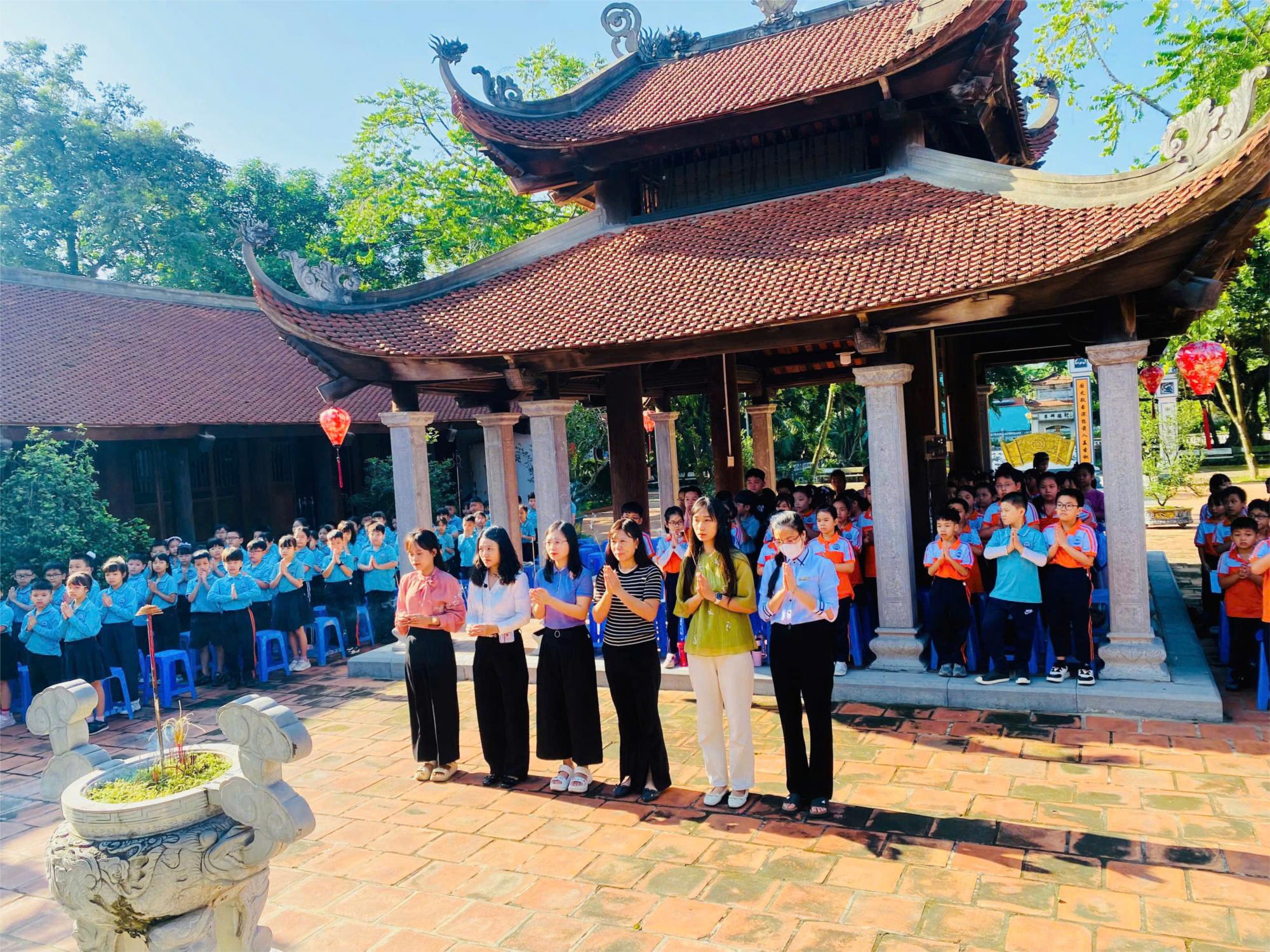 cụ từ quản đình hướng dẫn chúng em xếp hàng, nghiêm trang thực hiện nghi lễ bái