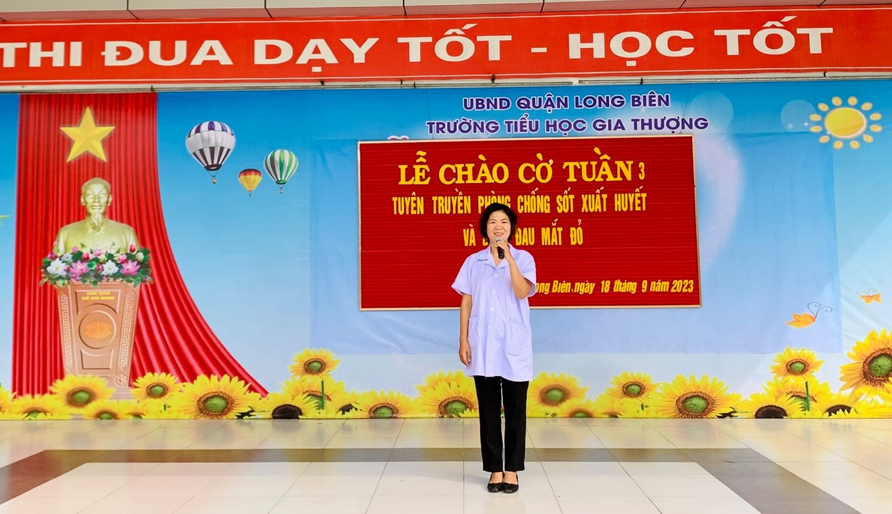 Sáng ngày 18/09/2023, trong giờ chào cờ đầu tuần, với sự tham gia của hơn 50 đồng chí cán bộ, giáo viên, nhân viên và 969 học sinh toàn trường, buổi tuyên truyền phòng bệnh sốt xuất huyết và đau mắt đỏ của trường TH Gia Thượng đã diễn ra rất hiệu quả. Cô Nguyễn Thị Minh Thu, nhân viên y tế nhà trường đã mang đến các kiến thức về phòng chống bệnh sốt xuất huyết, bệnh đau mắt đỏ. Hiện nay dịch sốt xuất huyết và bệnh đau mắt đỏ đang tăng nhanh và bùng phát ở nhiều khu vưc, ảnh hưởng lớn tới sức khỏe của cộng đồng. Bệnh hiện chưa có thuốc đặc trị. Hiện nay dịch sốt xuất huyết và bệnh đau mắt đỏ đang tăng nhanh và bùng phát ở nhiều khu vưc, ảnh hưởng lớn tới sức khỏe của cộng đồng. Bệnh hiện chưa có thuốc đặc trị. Vậy nên, công tác phòng bệnh là rất quan trọng. Hiểu được tầm quan trọng của công tác phòng bệnh, sáng ngày 18/09/2023, trong giờ chào cờ đầu tuần, cô Nguyễn Thị Minh Thu, nhân viên y tế nhà trường đã mang đến những kiến thức về phòng chống bệnh sốt xuất huyết, bệnh đau mắt đỏ bổ ích cho giáo viên và học sinh toàn trường.