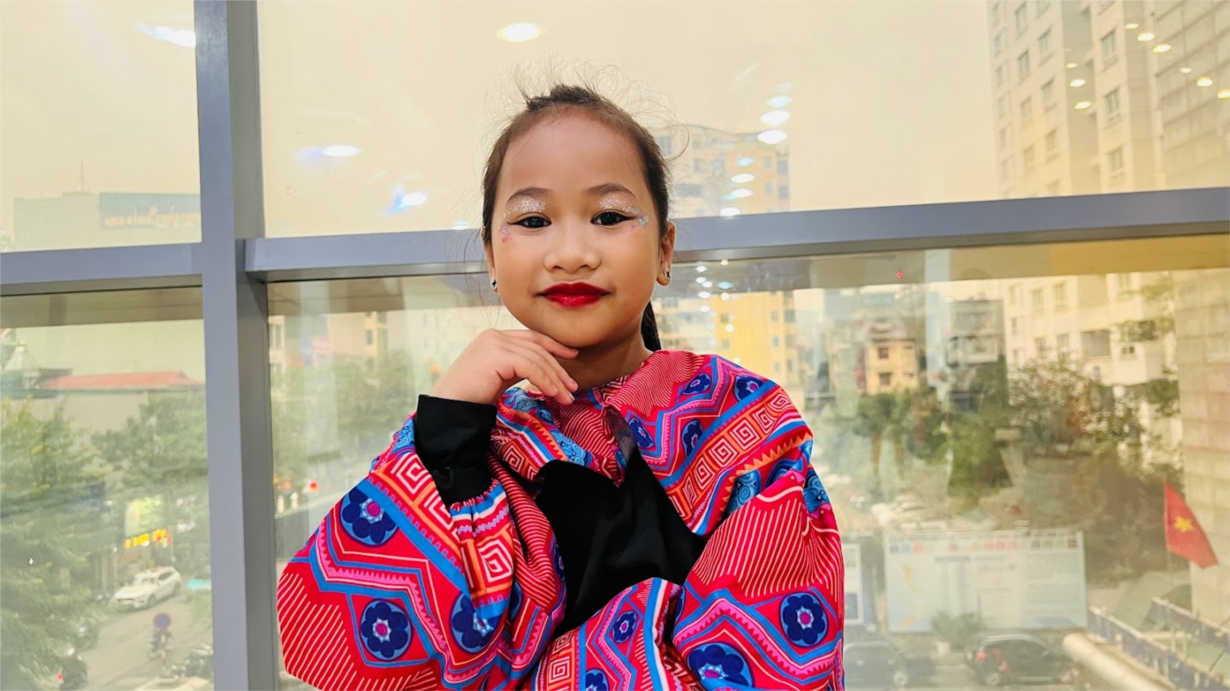 Minh Hà tham gia thi tài năng nhí quận Long Biên tiết mục “Phụ nữ Việt Nam Anh Hùng" tại đình Lệ Mật
