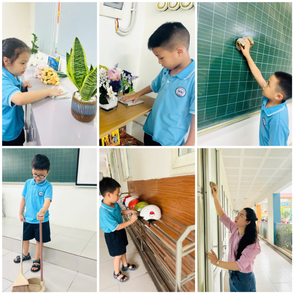 sắp xếp góc học tập gọn gàng, nhặt một chiếc lá rơi ngoài hành lang hay bỏ rác