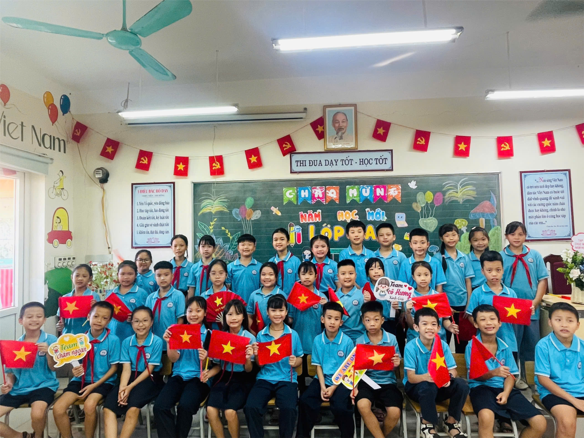 sinh lớp 4A3 đã có mặt đông đủ, trong bộ đồng phục màu xanh hòa bình, vẫn còn mới