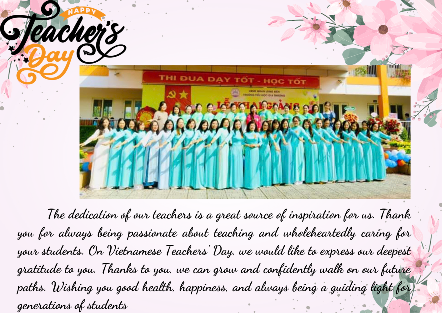 Nhân ngày Nhà giáo Việt Nam 20/11, em muốn viết những lời cảm ơn chân thành nhất, sâu sắc nhất để gửi đến thầy cô giáo trường Tiểu học Gia Thượng – những người đã dành toàn bộ tâm huyết và sức lực của mình để giảng dạy chúng em, đồng hành cùng chúng em trong quá trình khám phá tri thức và trưởng thành.