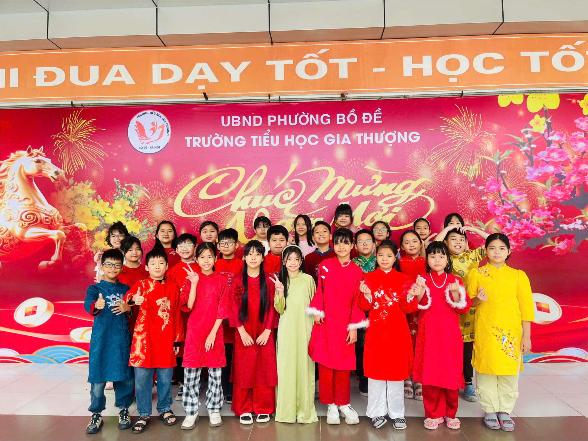 đối đỏ và những phong bao lì xì rực rỡ sắc màu. Các em học sinh trong trang