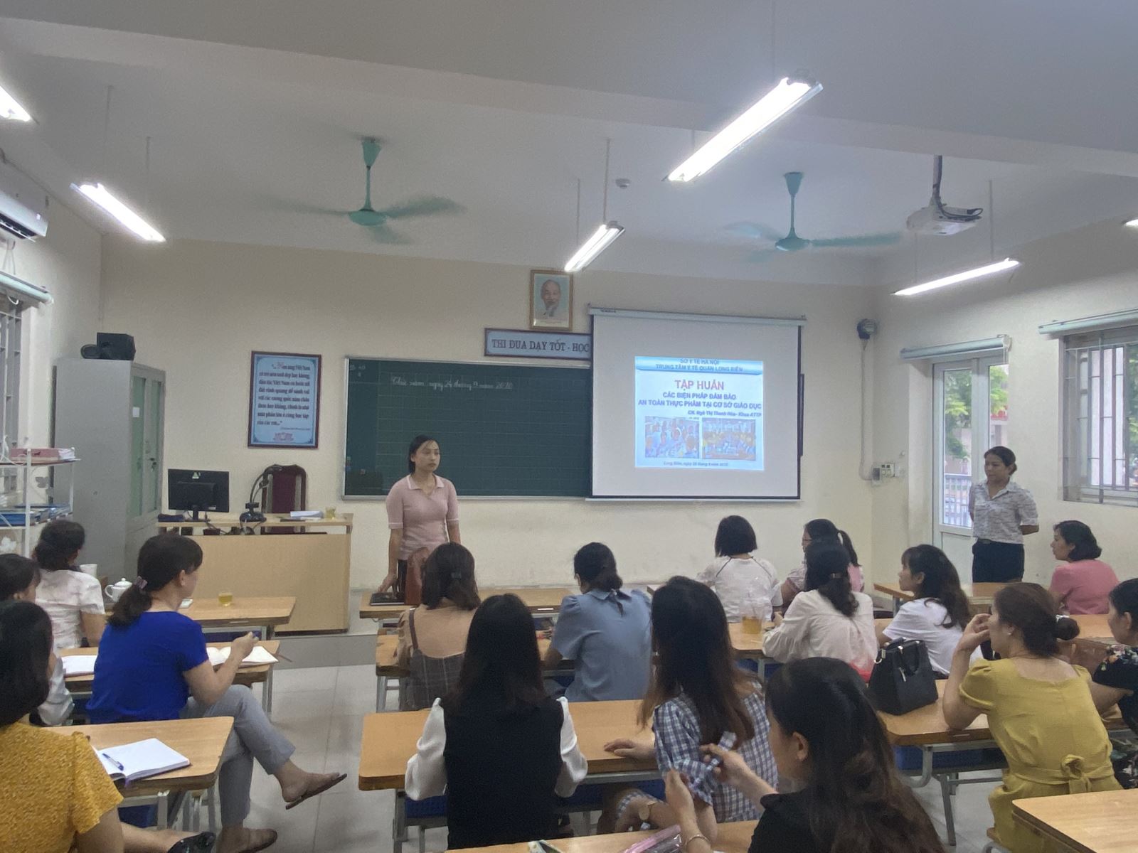 Trong buổi tập huấn, các giáo viên, nhân viên của nhà trường còn được trao đổi về các qui định về ATTP tại bếp ăn tập thể. Các hành vi vi phạm hành chính thường gặp về ATTP (Căn cứ Điều 15 của Nghị định 115/2018/NĐ-CP ngày 04/9/2018). Cách đề phòng ngộ, xử lý khi xảy ra ngộ độc thực phẩm. Buổi tập huấn đã góp phần nâng cao kiến thức về VSATTP cho CBGVNV nhà trường . Kết thúc buổi tập huấn, cán bộ, giáo viên và nhân viên nhà trường đã làm bài thu hoạch để được cấp Giấy chứng nhận về ATTP theo quy định.