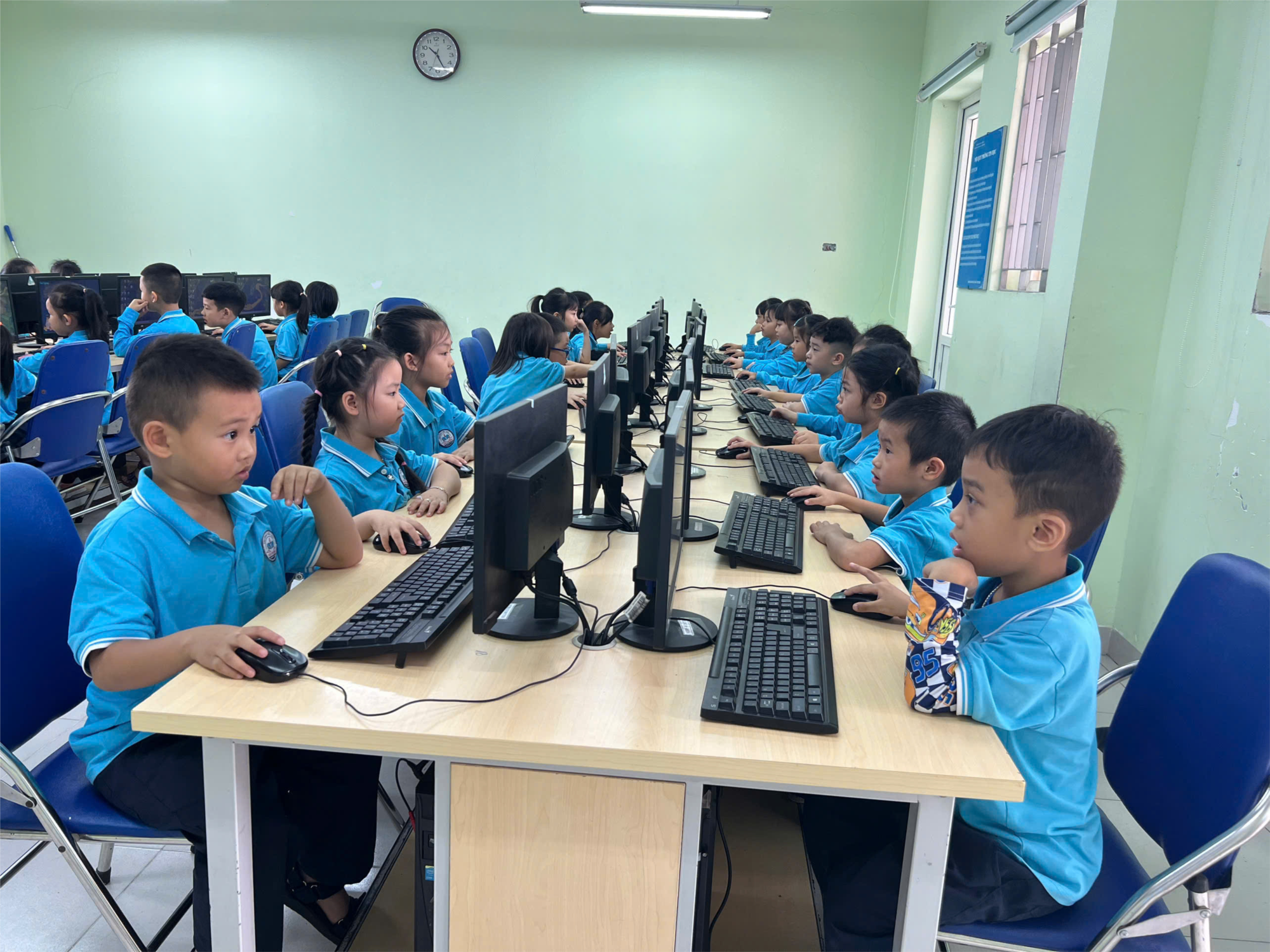 các em học sinh lớp 1A1 với các tiết học Kỹ năng công dân số tại phòng Tin học.