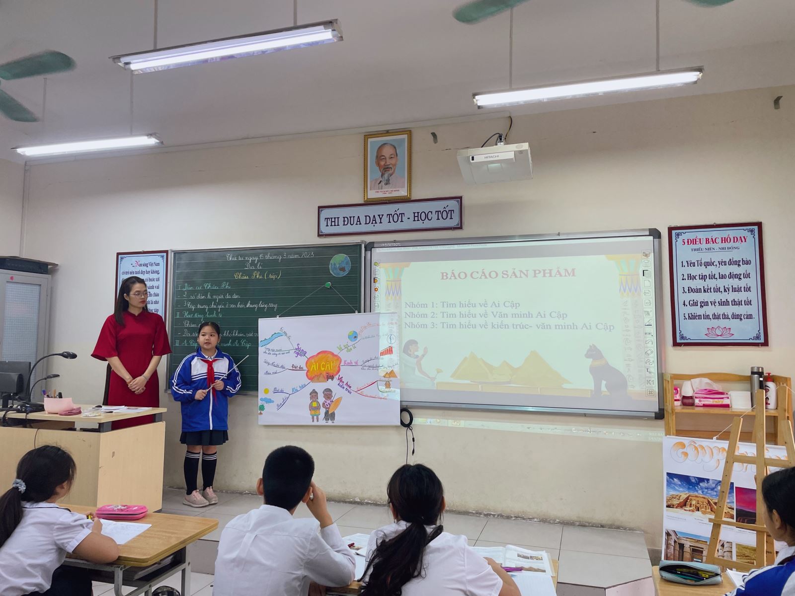 Là một giáo viên trẻ, không ngừng học hỏi để nâng cao trình độ chuyên môn, cô giáo Thu Hương, với sự thống nhất cao của tổ chuyên môn khối 5 đã thiết kế và tổ chức bài dạy Châu Phi (tiếp theo) bằng phương pháp dạy học theo dự án qua đó góp phần nâng cao năng lực học sinh và đổi mới phương pháp dạy học, giúp khơi gợi trí tò mò, khám phá, óc sáng tạo của học trò. Trong hoạt động làm việc nhóm, bằng sự cố gắng, nỗ lực của bản thân cùng với sự hỗ trợ, định hướng của cô giáo Thu Hương, các bạn nhỏ lớp 5A2 đã hoàn thành sản phẩm riêng của mình và cùng nhau chia sẻ với các bạn trong lớp.