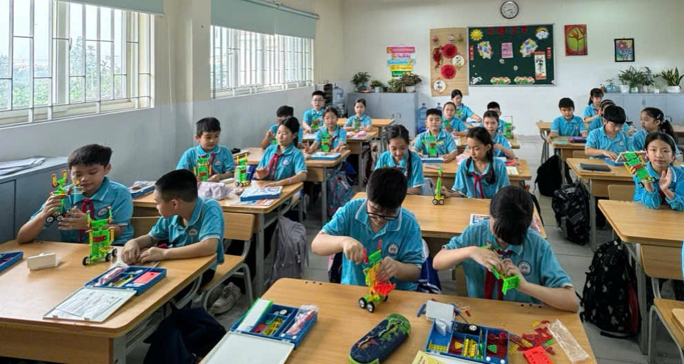 Thay vì ngồi viết bài như thường lệ, các em được thực hành lắp ráp mô hình rô bốt