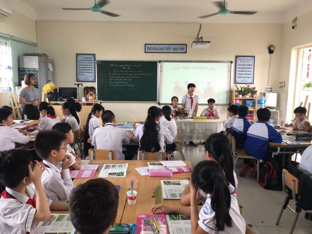 Ngay sau phần giới thiệu bài mới, cô giáo đã đặt ra yêu cầu của tiết học thông qua các mục tiêu cần đạt để học sinh có định hướng trong quá trình tìm hiểu, lĩnh hội kiến thức. Hoạt động 1 với mục tiêu tìm hiểu một số biện pháp bảo vệ môi trường, học sinh đã làm việc với sách giáo khoa để rút ra được các biện pháp chính bảo vệ môi trường. sau phần làm việc với sách giáo khoa, cô giáo vận dụng kĩ thuật dạy học “Hỏi chuyên gia” để giúp học sinh chủ động tìm hiểu sâu hơn kiên thức. Nhờ được giao nhiệm vụ từ tiết học trước mà trong tiết học này, nhiều học sinh đã tự tin xung phong làm “ chuyên gia tư vấn”. Những câu hỏi, thắc mắc của các bạn trong lớp được nhóm chuyên gia chia sẻ rất nhiệt tình và giải thích rõ ràng. Kĩ thuật dạy học “Hỏi chuyên gia” giúp các em học sinh rèn kĩ năng tự tin, trao đổi, thuyết trình, vấn đáp và giải quyết các tình huống một cách linh hoạt. Cách cô giáo tổ chức thảo luận theo nhóm cũng làm tiết học sôi nổi hơn nhiều.