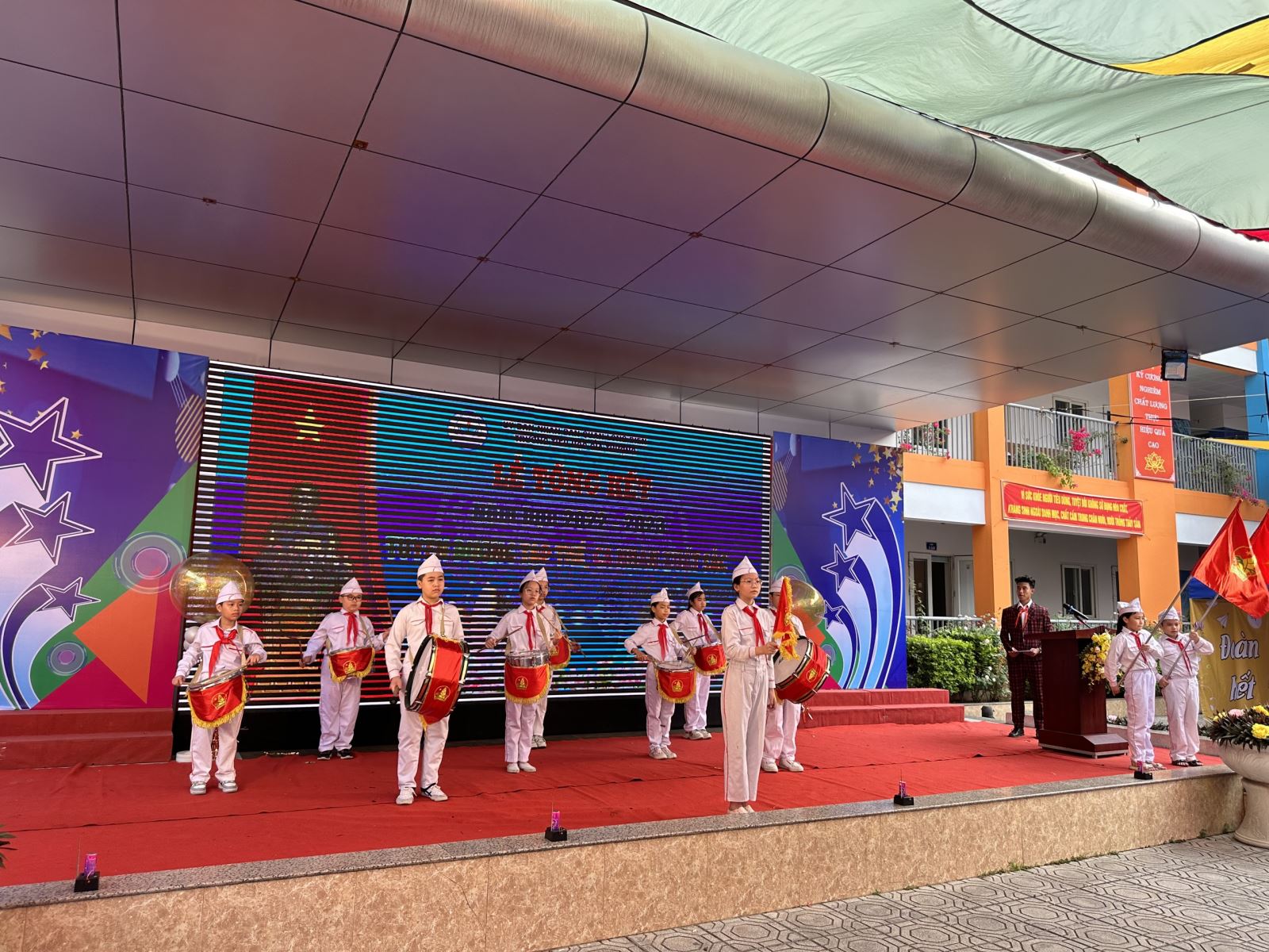 Đại diện học sinh khối 5 phát biểu cảm nghĩ, tri ân thầy cô qua các tiết mục văn nghệ đầy cảm xúc của cô và trò nhà trường. Để bày tỏ tấm lòng biết ơn sự dạy dỗ của các thầy cô đối với các con học sinh, đại diện Hội CMHS trường có bó hoa tươi thắm tri ân tới các thầy cô.